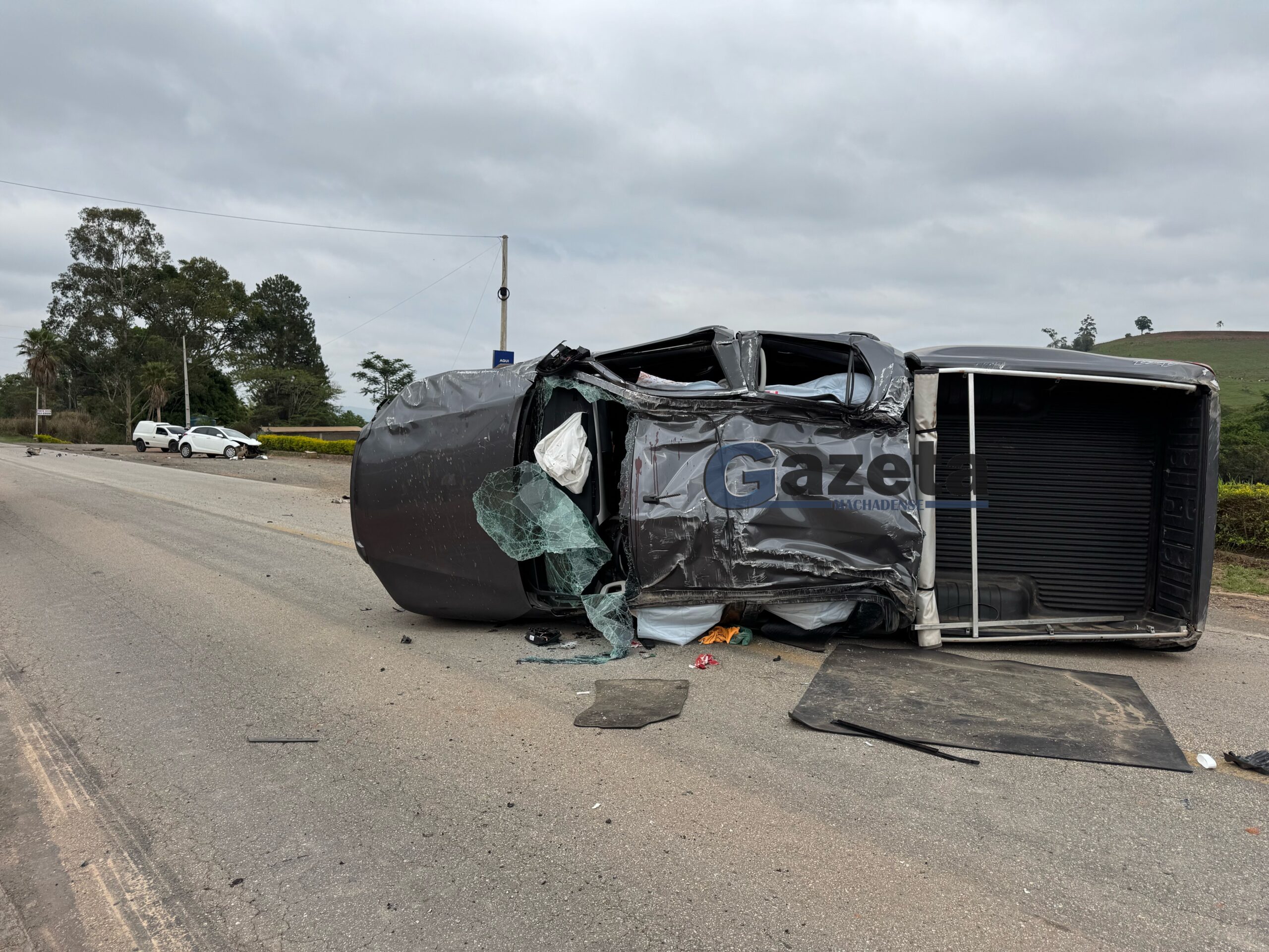 Um Hyundai HB20 e uma Toyota Hilux colidiram no quilômetro 39 da rodovia MG 179, nas proximidades de um pesqueiro e de uma fábrica de