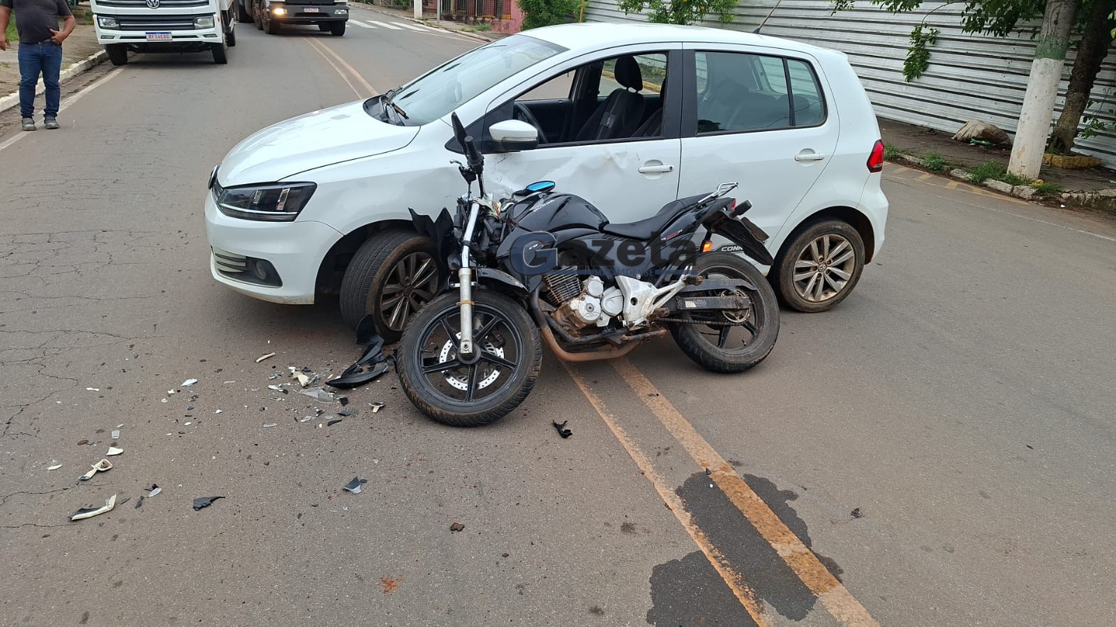 Uma motocicleta e um automóvel utilizado como táxi colidiram, na manhã desta quinta-feira (22), na Avenida Plinio da Silva Dias, no bairro Bom Recanto. O