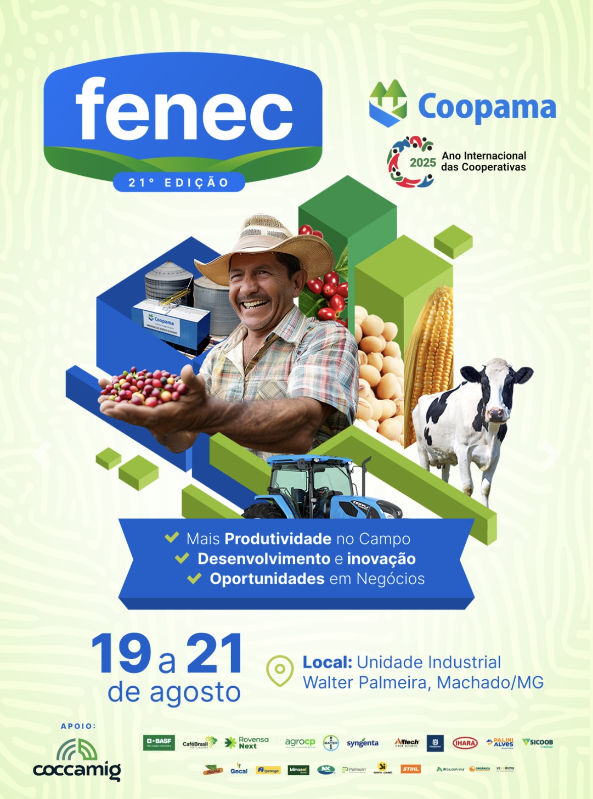 A Coopama (Cooperativa Agrária de Machado) realiza, nos dias 19, 20 e 21 de agosto, a 21ª edição da Fenec (Feira de Negócios Coopama). Consolidado