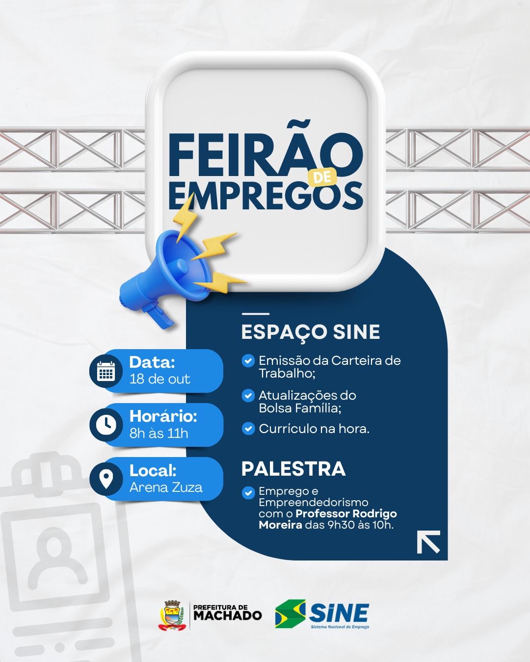 A Prefeitura de Machado, por meio da Secretaria de Desenvolvimento e Promoção Social e do SINE (Sistema Nacional de Emprego), junto à vereadora Ana Teixeira,