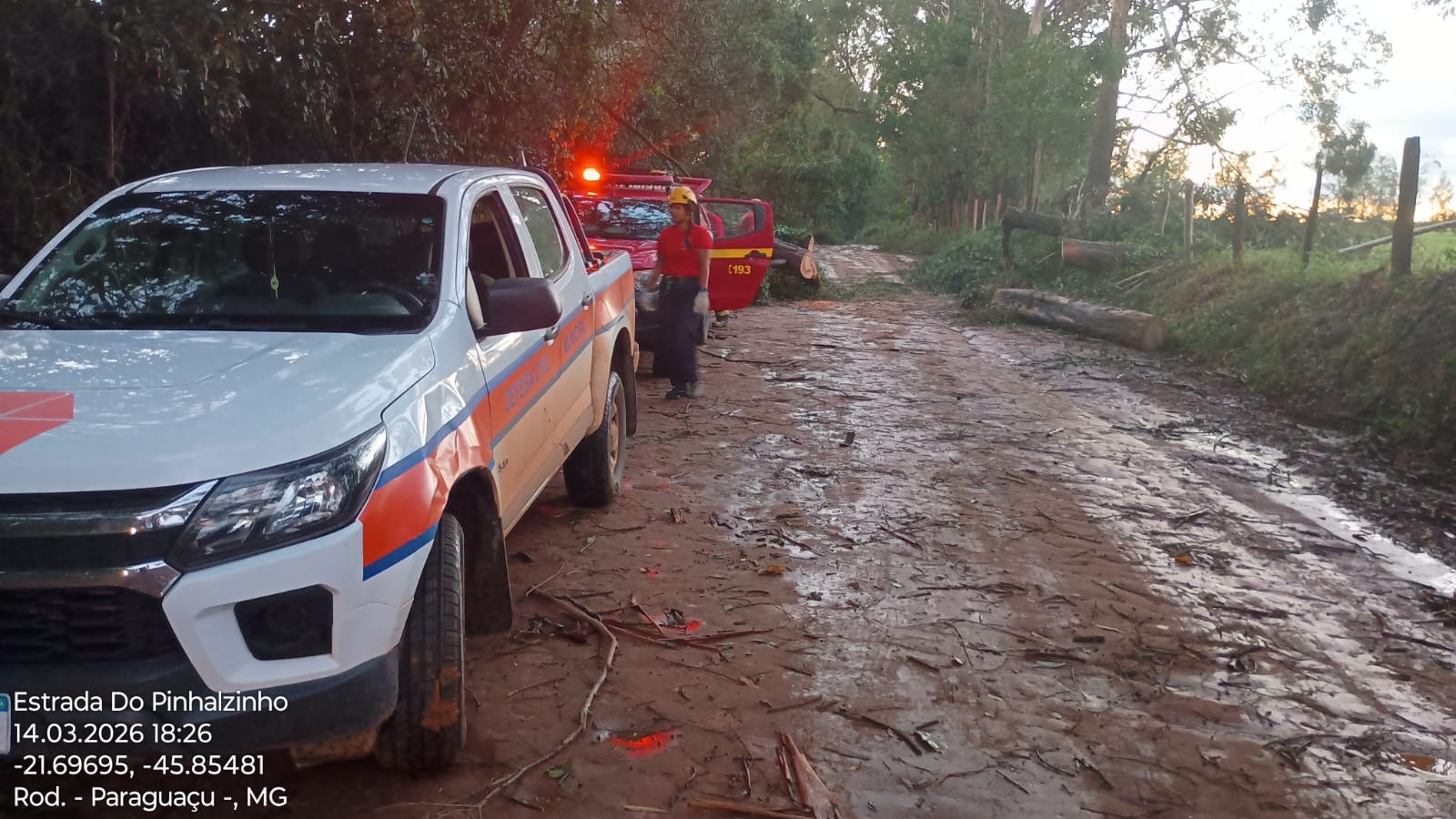 Equipes do Corpo de Bombeiros e da Defesa Civil, com apoio de sitiantes da região afetada, estiveram no local realizando as primeiras ações para desobstrução da via.