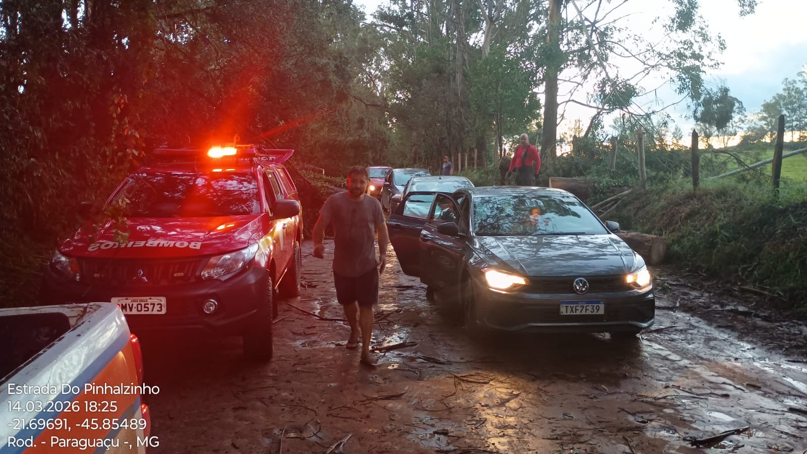Equipes do Corpo de Bombeiros e da Defesa Civil, com apoio de sitiantes da região afetada, estiveram no local realizando as primeiras ações para desobstrução da via.
