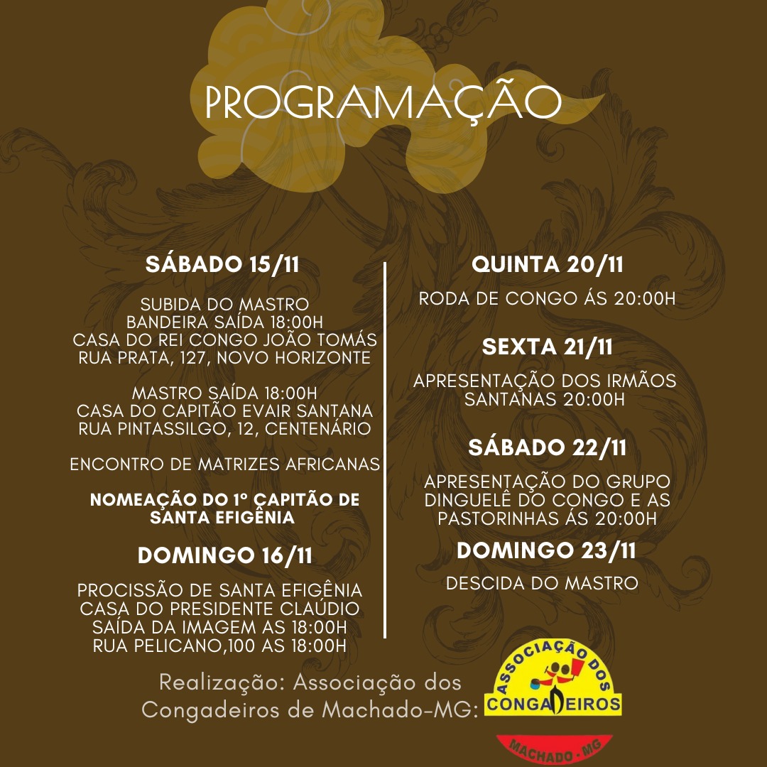 Neste sábado (15), a abertura da festa contará com a Subida do Mastro com a bandeira de Santa Efigênia, na Praça de São Benedito, a partir das 18 horas, quando a bandeira sairá da casa do Rei Congo, João Tomás, localiza na Rua Prata, no bairro Novo Horizonte, enquanto o mastro será levado da residência do Capitão Evair Santana, situada na Rua Pintassilgo, na Vila Centenário. Ambas se encontram no ponto destinado à festa, onde também haverá o Encontro de Matrizes Africanas e a nomeação do 1º Capitão de Santa Efigênia.
