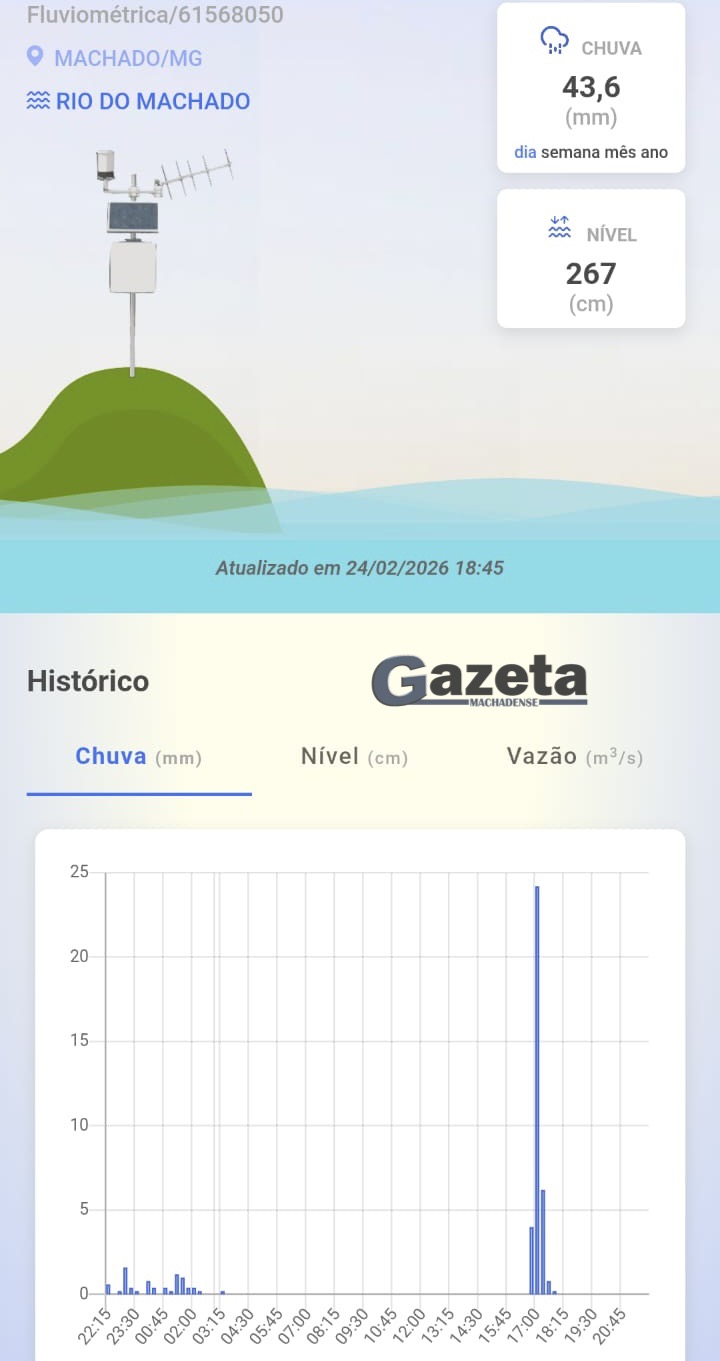 “Até o momento, não tivemos nenhum chamado ou pedido de ajuda registrado. Mas vale salientar que a chuva que caiu em Machado, nesta data, foi uma coisa extremamente anormal. Foram 44,2 milímetros, num pequeno espaço de tempo: das 15h45 às 17h15. E o pico maior se deu às 17 horas, quando o volume de precipitação chegou a 25 milímetros. Isso não é comum. É como se você pegasse uma garrafa de um litro de qualquer tipo de bebida e despejasse em um copo pequeno, achando que todo aquele volume coubesse no recipiente”, explica Gilberto.