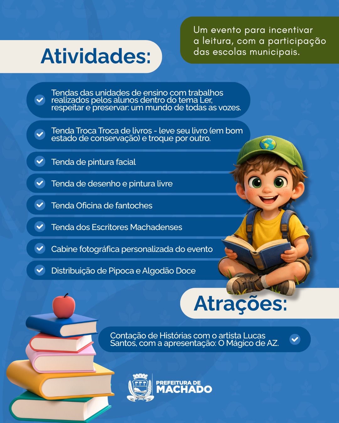 O evento contará ainda com barraquinhas das instituições municipais mostrando o trabalho de cada uma no incentivo à leitura, troca de livros, pintura facial, espaço livre para desenho e pintura, oficina de fantoches, tenda de escritores machadenses, cabine fotográfica personalizada e distribuição de pipoca e algodão doce, criando um ambiente acolhedor e inspirador para toda a família.