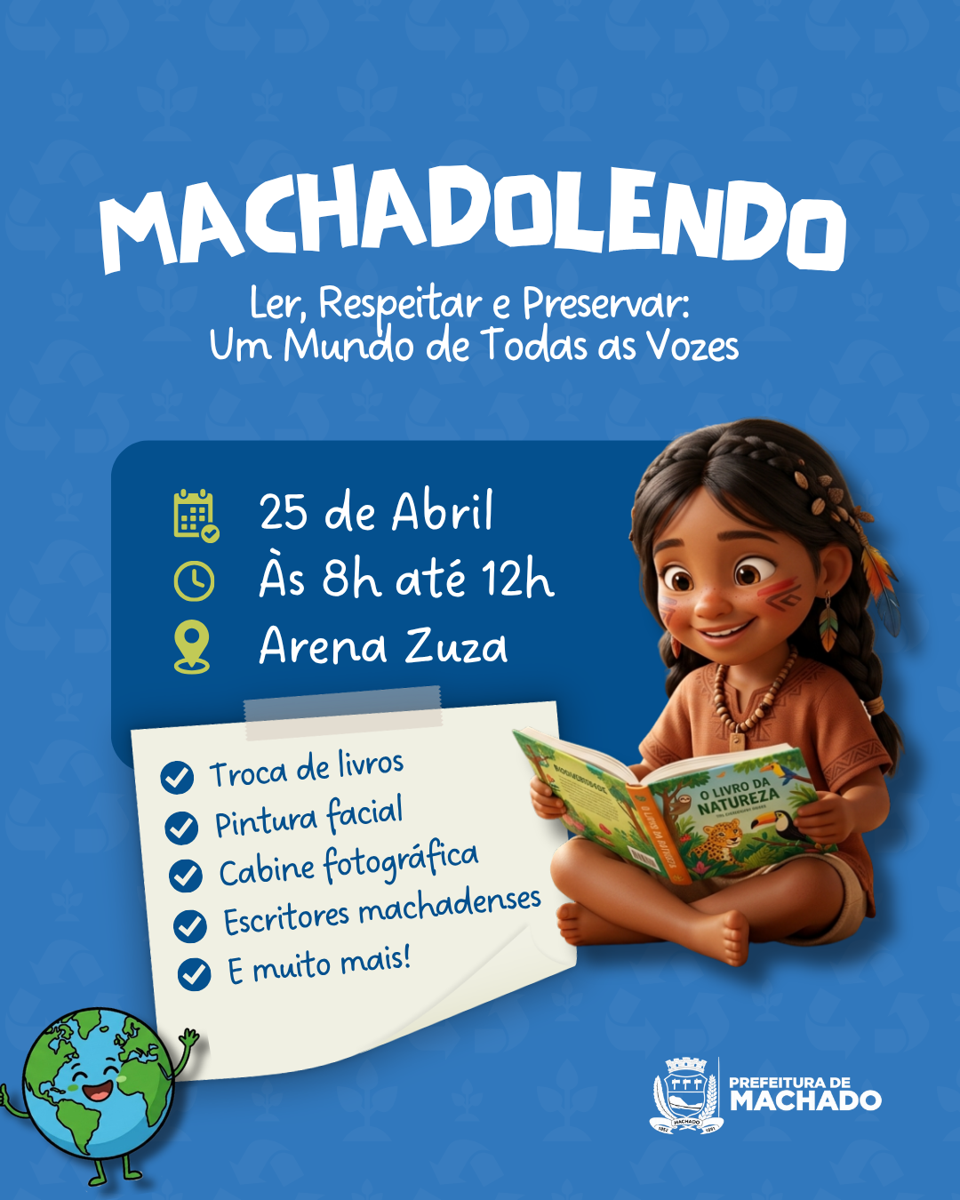 A Prefeitura de Machado, através da Secretaria de Educação, promove, no próximo dia 25 (sábado), mais uma edição do MachadoLendo – evento que celebra a criatividade, a imaginação e o poder transformador da leitura. O acontecimento será realizado das 8 às 12 horas, na Arena Zuza, e reunirá alunos das escolas municipais, educadores e toda a comunidade em uma manhã dedicada ao conhecimento e à cultura.