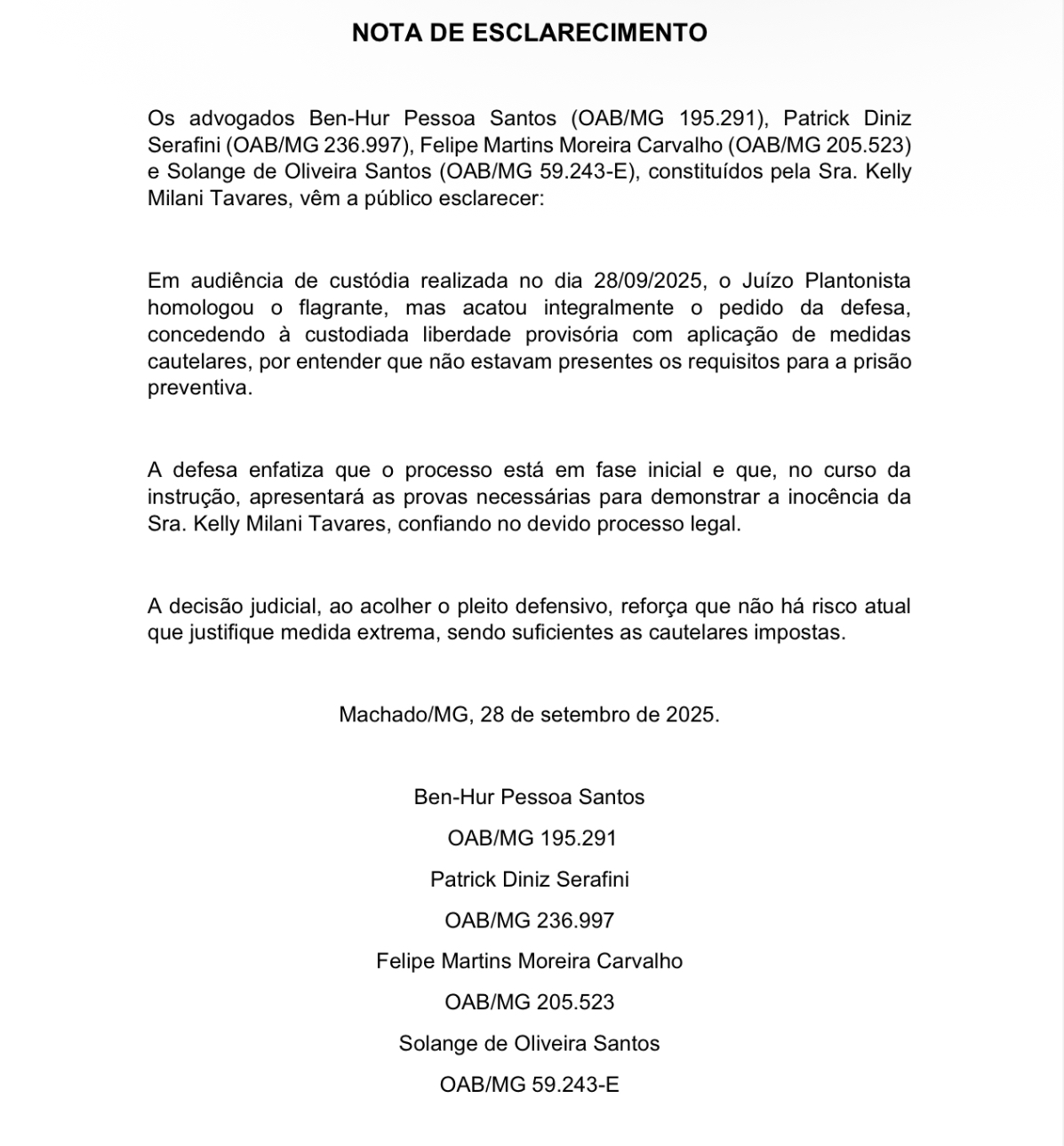 A notícia da liberação da mulher que agrediu a própria mãe idosa foi repassada à reportagem da Gazeta pelos advogados Ben Hur Santos, Patrick Serafini, Felipe Carvalho e Solange Santos através de uma nota de esclarecimento. No documento, os representantes legais da autora afirmam que a magistrada de plantão concedeu liberdade provisória com aplicação de medidas cautelares à cliente por entender que não estavam presentes os requisitos para a representação da prisão preventiva. Confira a nota: