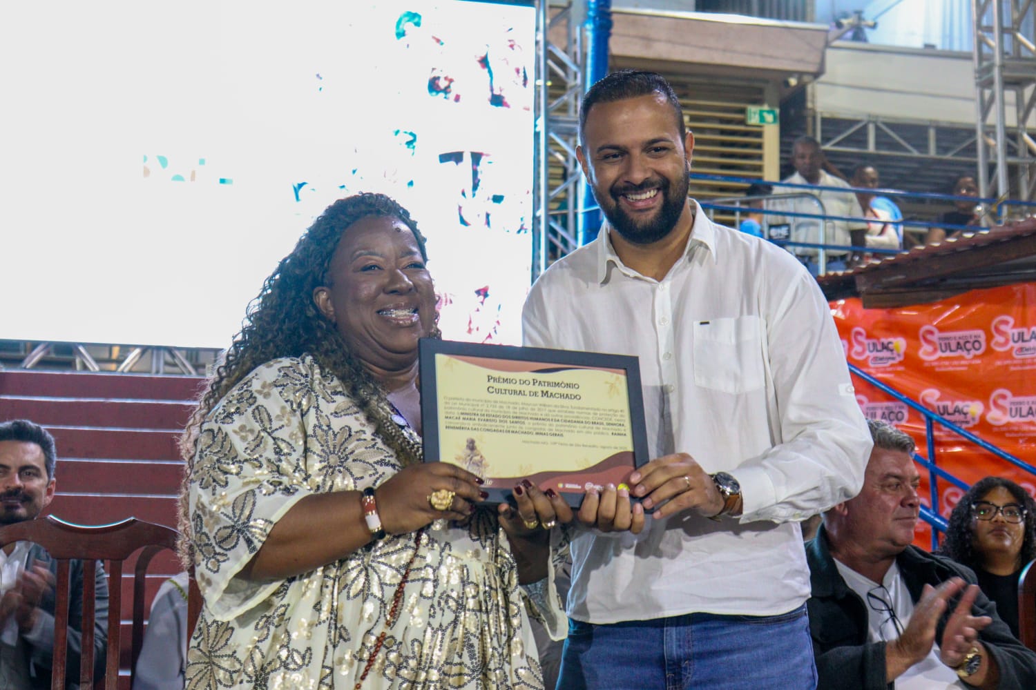 À noite, na novena em honra a São Benedito, a emoção tomou conta do público com a entrega dos certificados de Patrimônio Cultural do Brasil aos capitães e representantes das congadas locais. A Câmara de Vereadores também prestou uma homenagem especial à ministra Macaé, concedendo-lhe o Título de Cidadã Honorária de Machado.