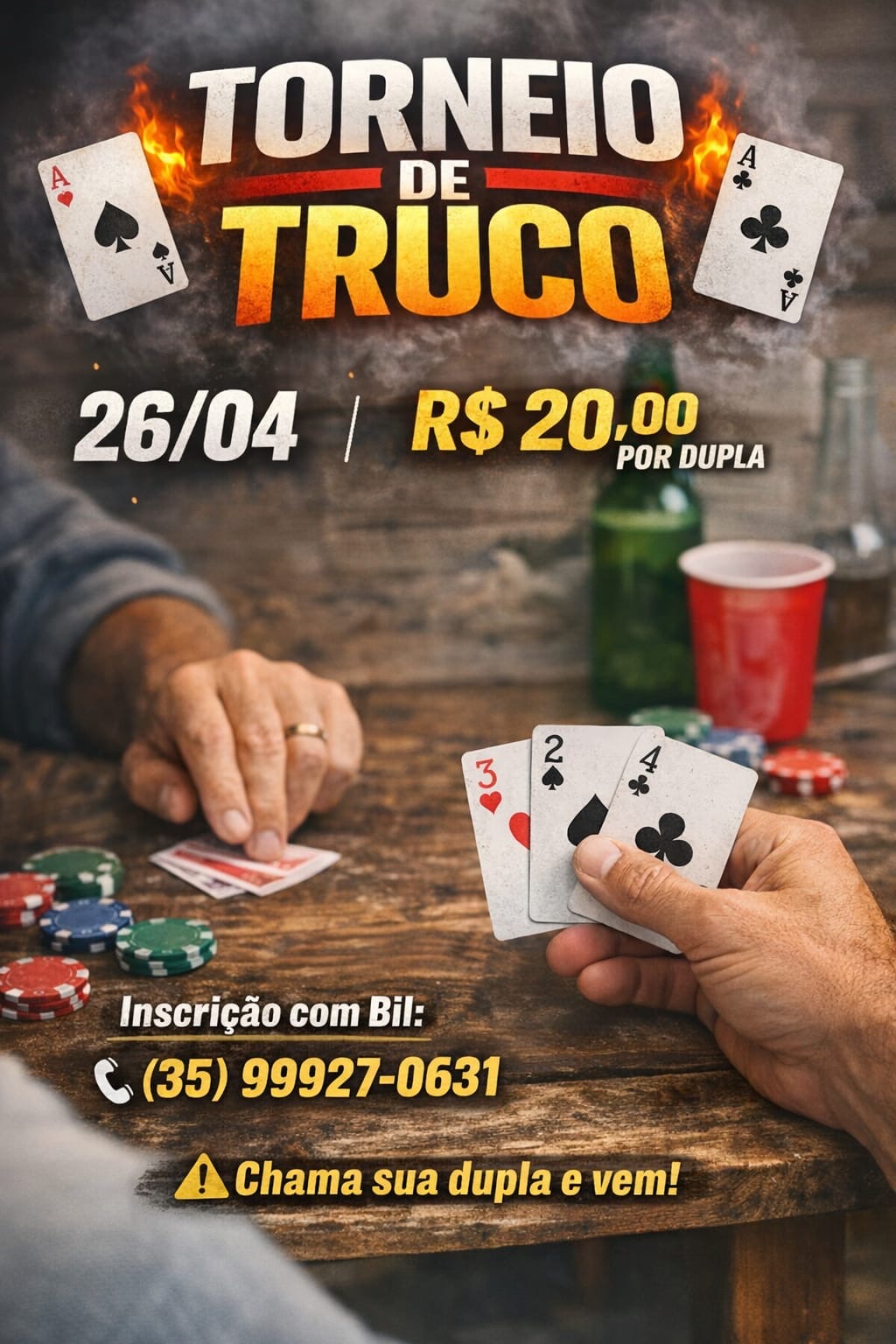 As inscrições para o campeonato de cartas podem ser feitas até momentos antes do início e custam R$ 20 por dupla. Mas, para aqueles que pretendem se antecipar, basta entrar em contato através do WhatsApp (35) 99927-0631.